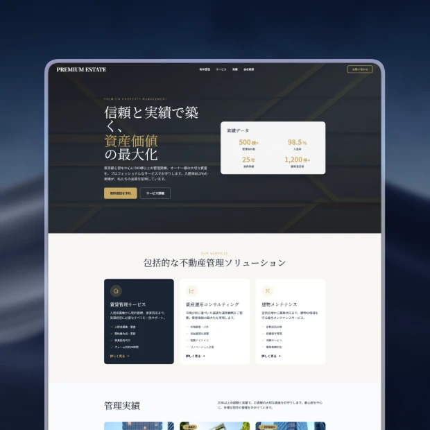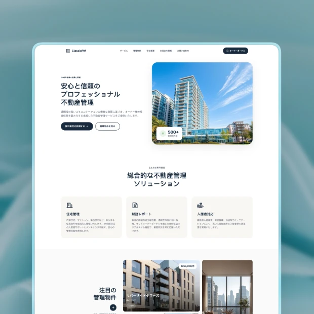 賃貸物件管理からオーナー対応まで、必要な機能がすべて揃ったプロ仕様のテンプレート。AI自動生成で、短時間で信頼感のあるサイトを公開できます。