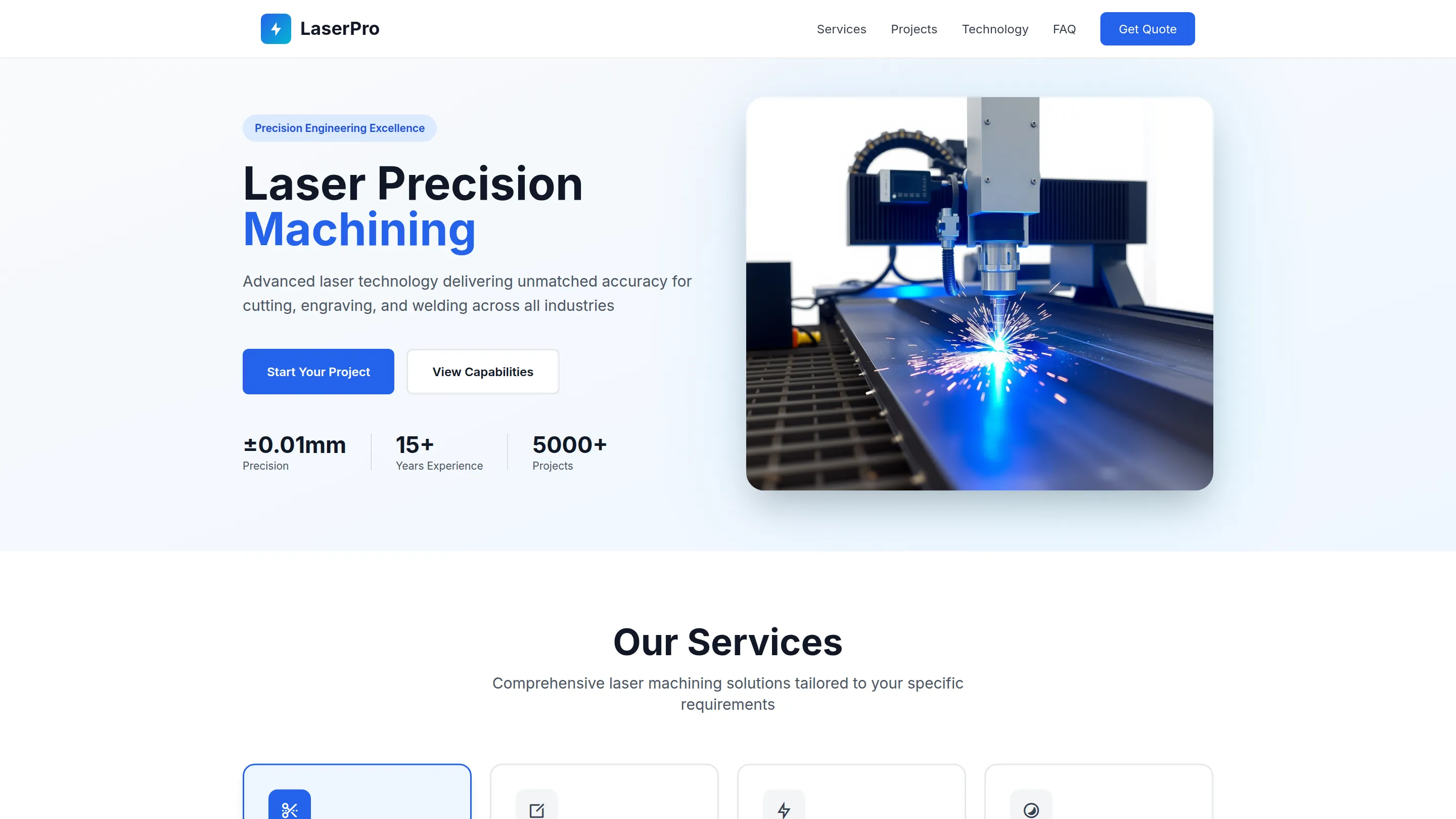 LaserPro delivers top-tier laser precision machining with cutting-edge technology. Whether you need intricate metal cutting, detailed engraving, or seamless welding, our advanced systems achieve tolerances of ±0.01mm. With over 15 years of experience serving aerospace, medical, automotive, and electronics industries, we're your trusted partner for high-quality laser machining. Our ISO-certified facility operates 24/7 to meet your deadlines. Using this powerful website builder, we've created a platform that showcases our capabilities and makes it easy for clients to request quotes and start projects. From rapid prototyping to full production runs, we handle projects of any scale with precision and reliability.