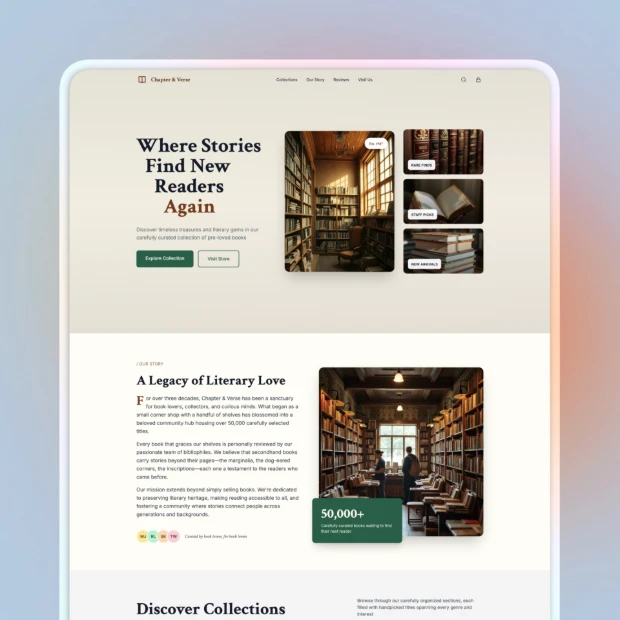 Provide a brief description of your shop’s mission, and let our AI instantly build a complete site with tailored layouts and book-centric content.