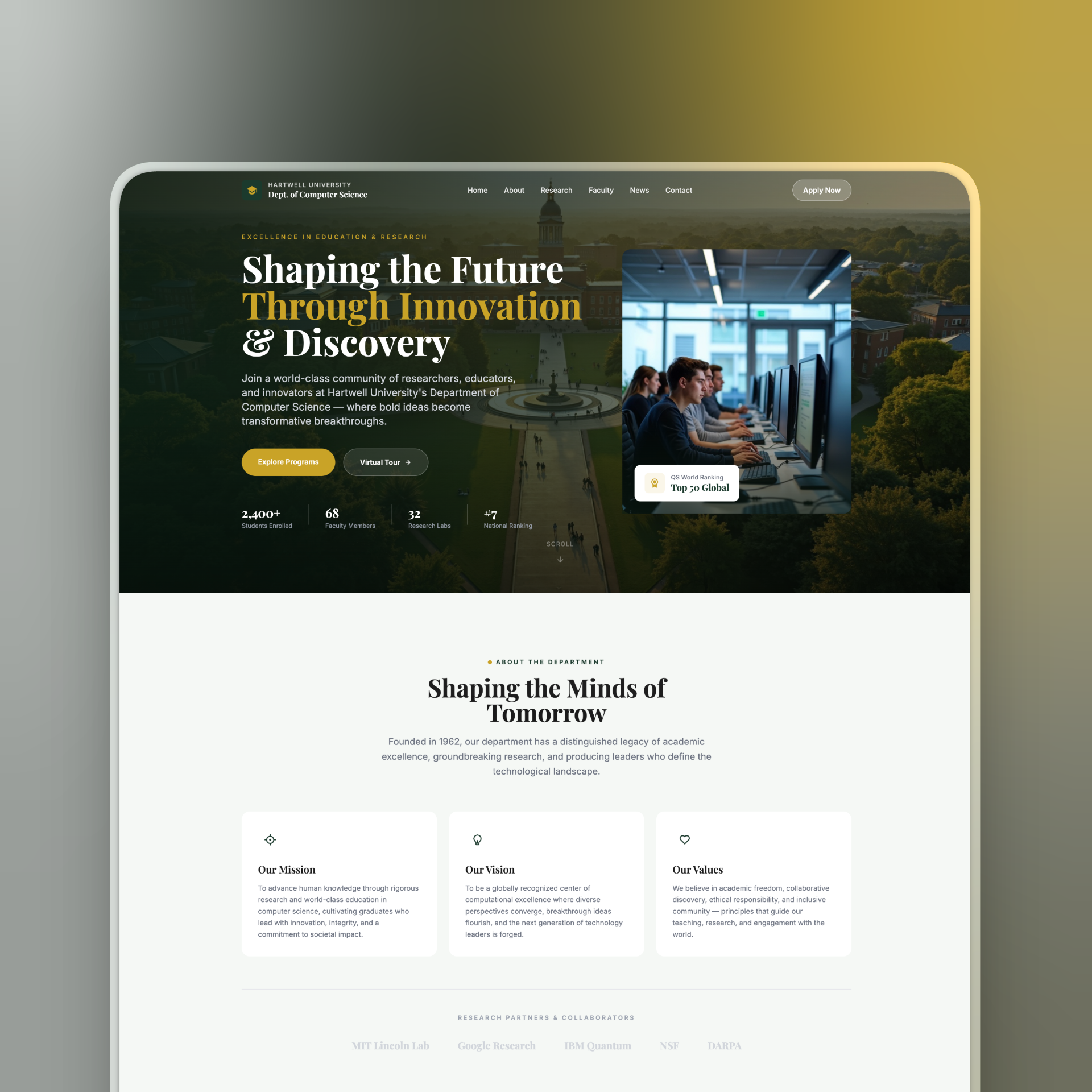 Pre-structured mega-menus and department pages make complex academic sites easy to navigate for students.