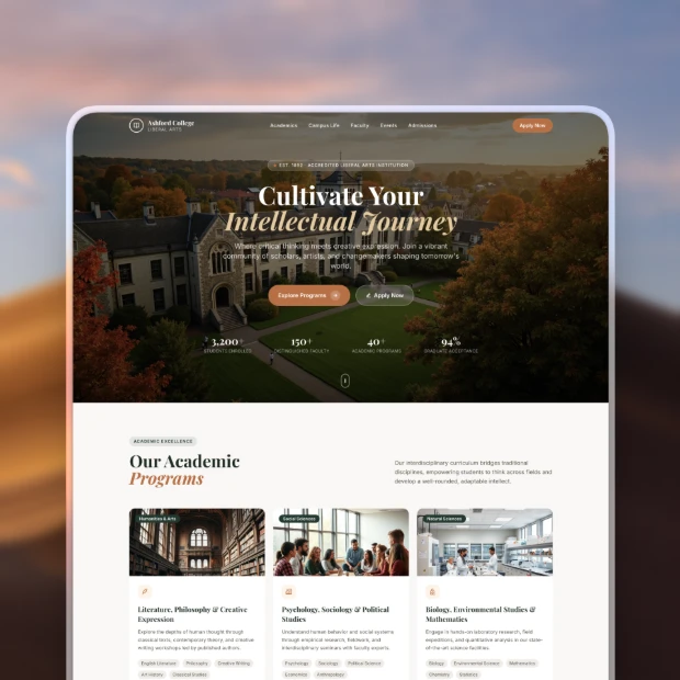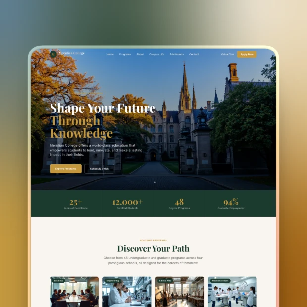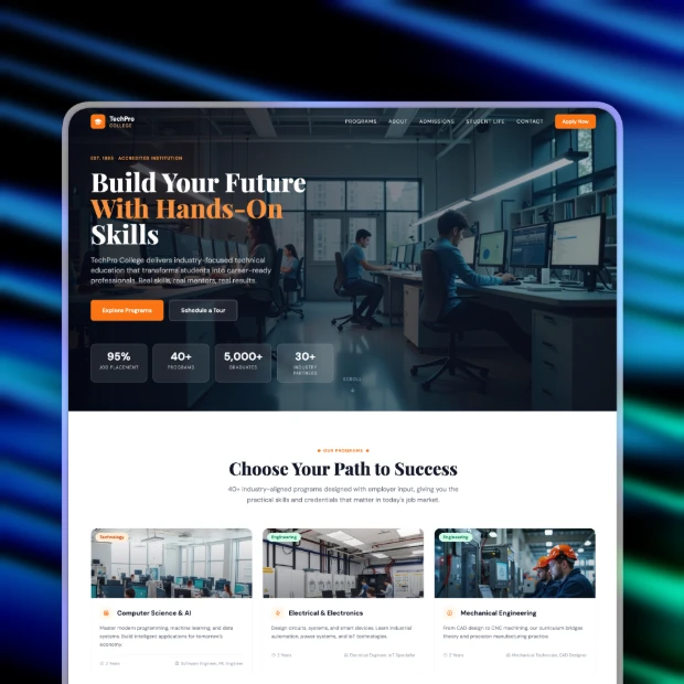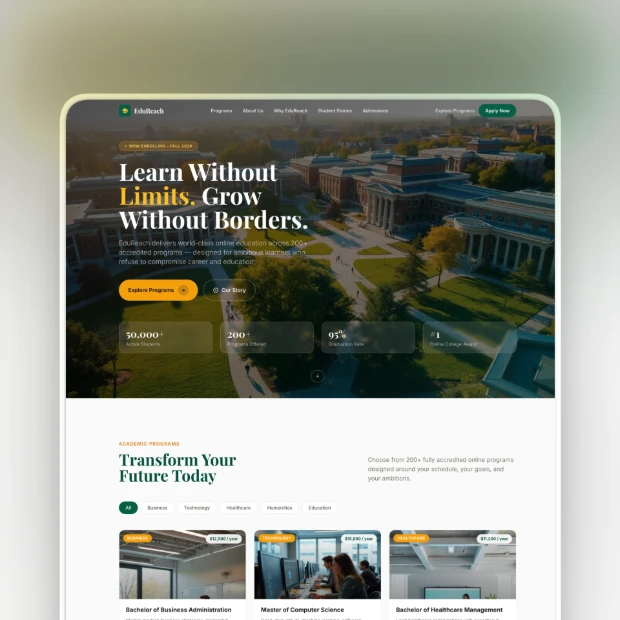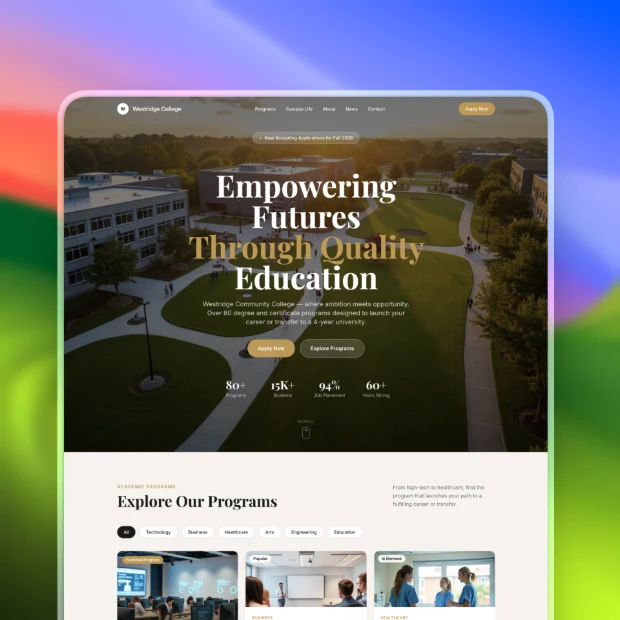 Simplify your digital enrollment process with adaptable college templates. Build and launch a professional, student-focused site in minutes.