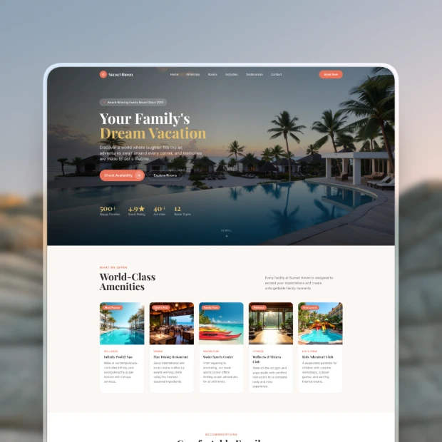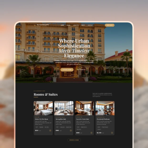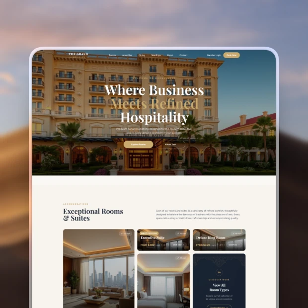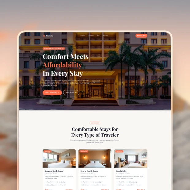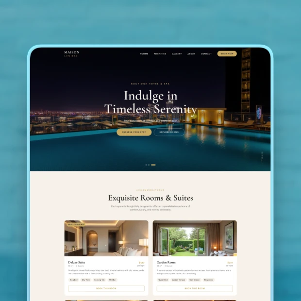 Showcase rooms, amenities, and availability in a clear structure. Guide visitors toward direct reservations.